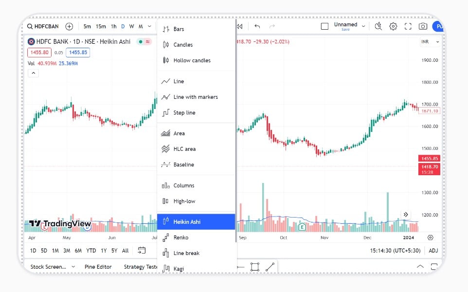- Diverse Chart Types: Switch between candlestick, bar, line, Heikin-Ashi charts, and more to suit your analysis style.