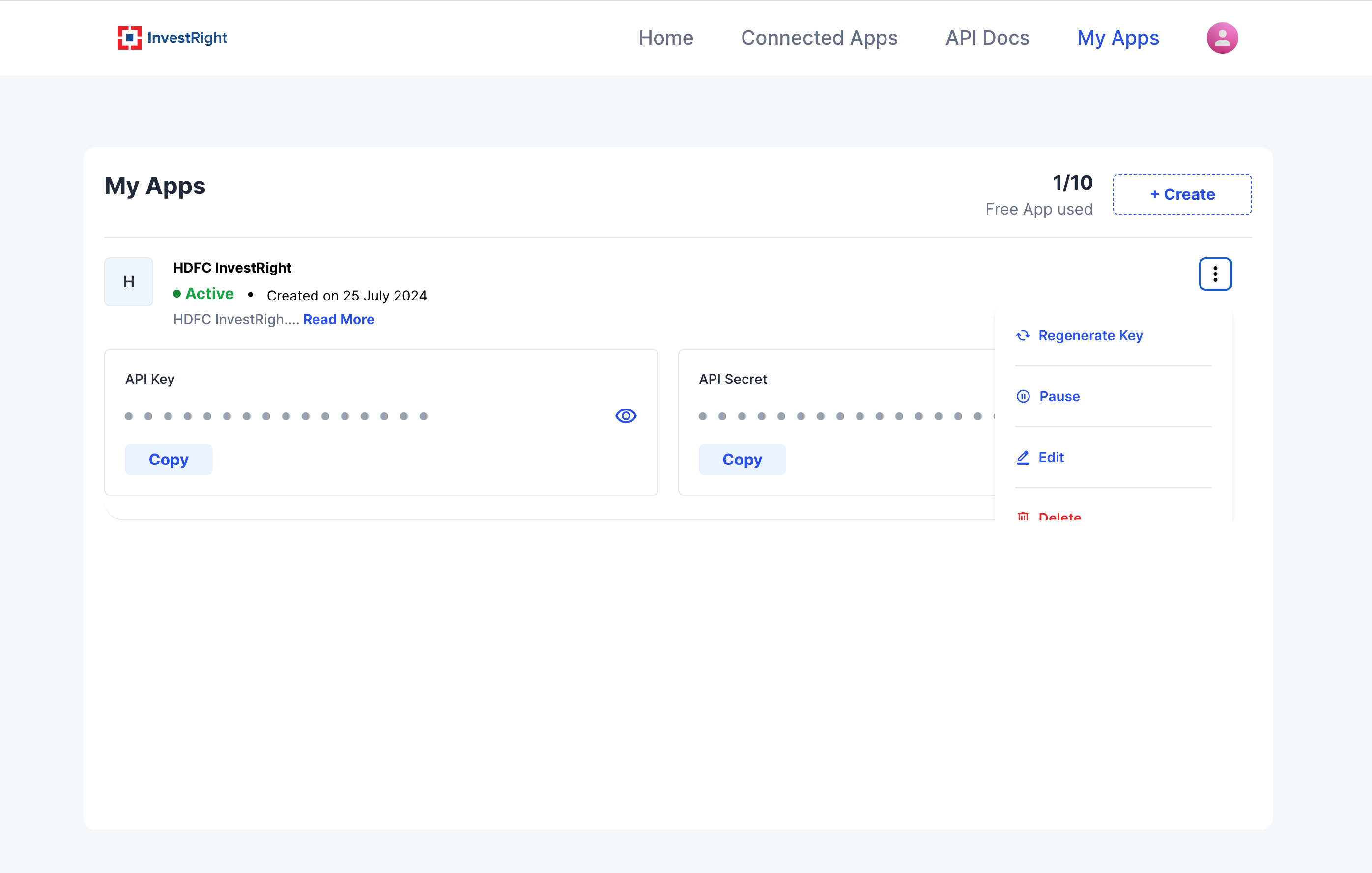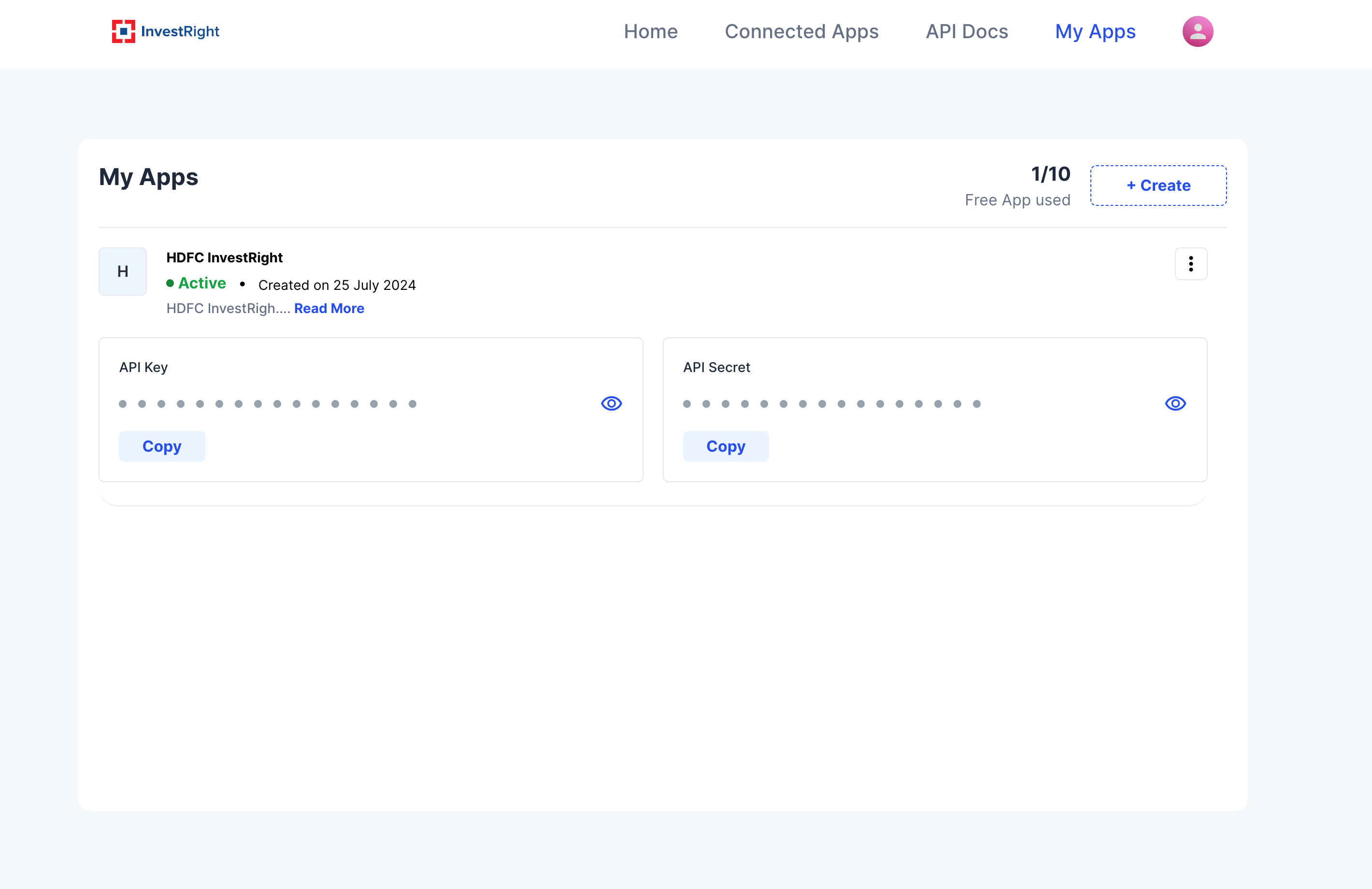 To view the hidden key, click on the eye icon. You can copy the key by clicking the Copy button.