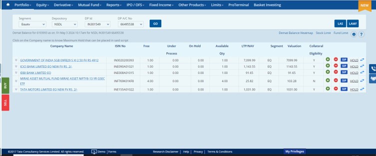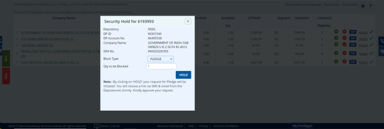 Step 2:- Click on Hold for the SGB,GSEC to Pledge
