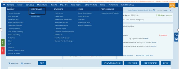 Step1: Go to www.hdfcsec.com web trading platform and login with user credentials. Go to Demat balance section and click on Equity.